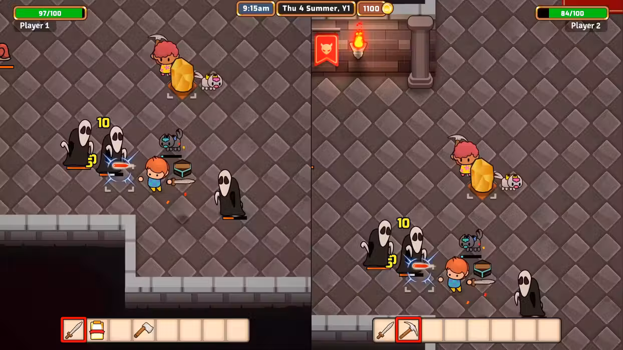 Rediscover the simple life. Farm, fish, forge and fight to restore the peace in an all-new farming adventure. Features split-screen coop, a helpful pet, automated drones, resourceful pixies, a card-eating progression system, and dangerous dungeons to delve into! "You once had a serene and peaceful existence right here in Everafter Falls. Don't you remember? You wake up to discover your previous life was nothing but a simulation. You've no memory of this place, your quaint animal neighbors, the refreshing wind and fragrant flowers, the little farm you had tucked away just outside town, none of it. But once you spend a little time with your forgotten friends and your helpful pet, doesn't Everafter Falls just feel perfect? Isn't it where you always wanted to be? Sure, you'll need to farm, fish and fight your way back to prominence in the tiny, cozy town, but you know your way around a sword, right? You know how to water your farm and progress through the dungeons. You know how to upgrade your stats and beat back tougher and tougher enemies, don't you? Just give those cards a good chomp and you'll have everything you need! Of course, if you need a little help, don't worry! Automated drones can expand your inventory, tend to your harvest, and even help you fight. And your pet missed you more than anything while you were under. They're here to help out around the farm, learning all sorts of neat things, like tilling your soil, watering your crops, and even teleporting you across the map. What? You've never heard of a teleporting cat before? It's Everafter Falls! Things are peaceful here. There's nothing to worry about... right?" Feature List Lifestyle Farming Sim: Farm, fish, and forage a huge collection of items to make the most efficient yet cozy farm. Uncover the Mystery: Help your new friends with their extremely important small-town drama through quests and conversation. Enlist Your Friends' Aid: Tackle your farm's toughest challenges with a friend in split-screen co-op! Delve through Dungeons: Four different dungeons will test your agility, strength and cunning as you fight your way to dangerous bosses! Become an Expert: Equip helpful little drones to help automate your farm keeping things running even when you're down in the dungeons. Farming Sim, Life Sim, RPG, Crafting, 2D, Indie, Simulation © 2024 SquareHusky