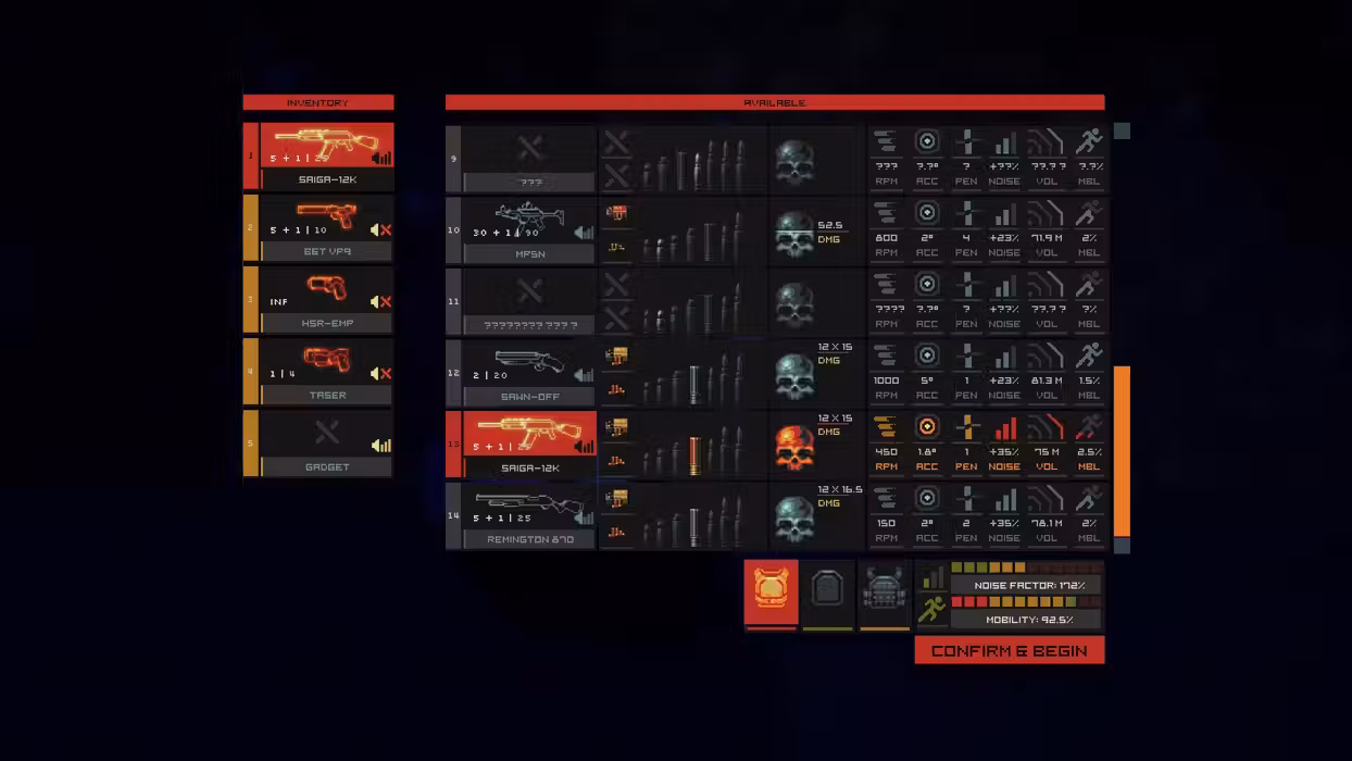 Choose your loadout. Pick a rifle, a pistol, and a bulletproof vest to be ready for combat, or just a pistol and naught else, to be quick, agile, and silent- ready for improvisation.