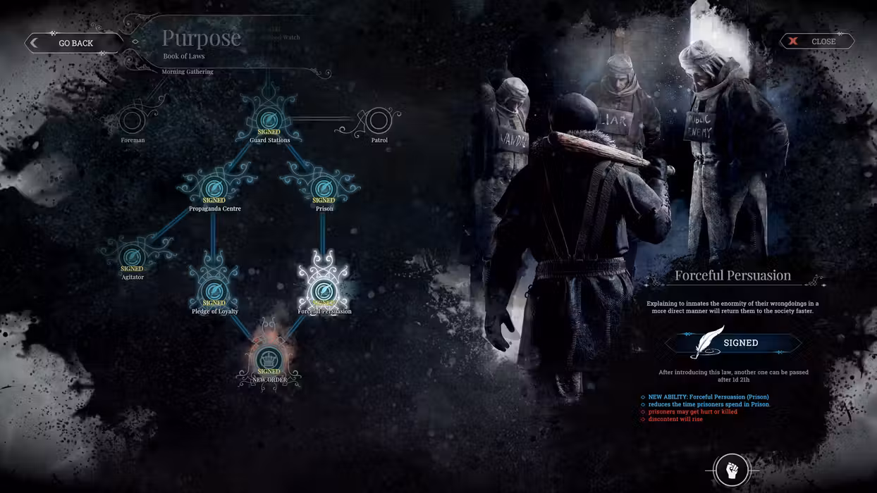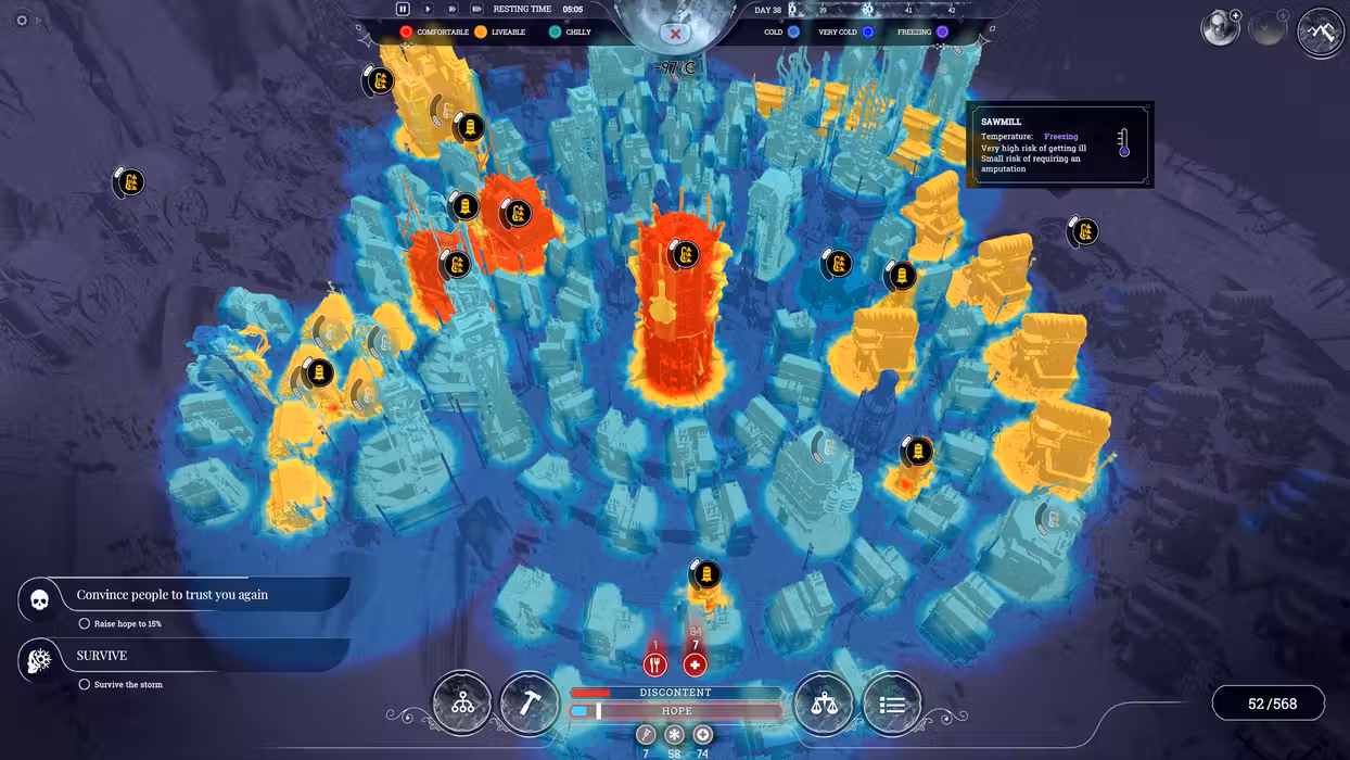 Establish laws that regulate the existence of your growing society. Decide on their working routine, healthcare, food provision and other crucial aspects of everyday life. Maintain their hope and contentment – the moral condition of your society is as important as securing the basic means to keep them fed and safe.