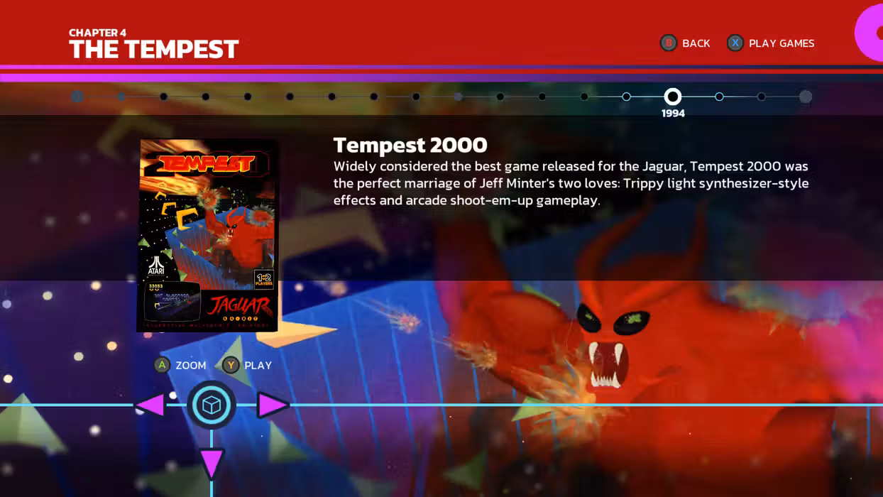 Two of Jeff Minter's earliest light synthesizers, Psychedelia and Colourspace, are also included, with all-new options and features optimized for controller-based play. Finally, Jeff's demo of