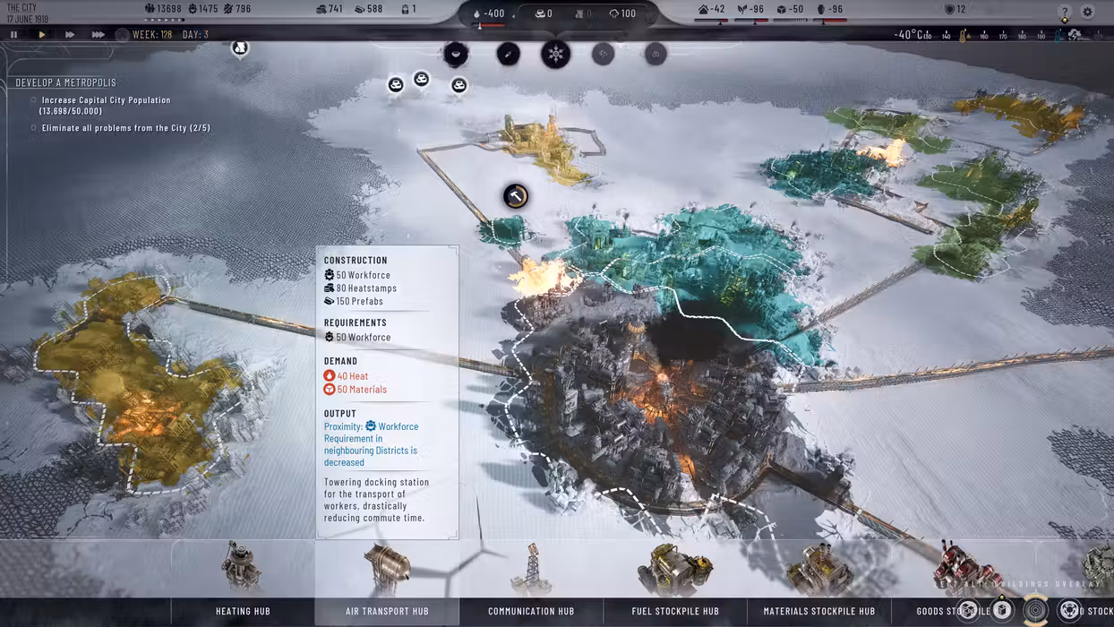 To ensure that your city growth will not falter, you have to venture into the frostland. There, you can build extensive colonies that will provide all the necessary resources.