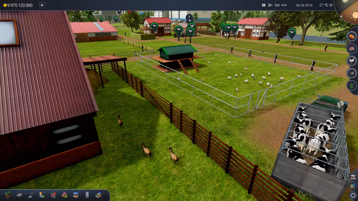 The cultivation of plants is not enough? Farm Manager 2018 allows for breeding animals. Starting from the smallest such as bees, rabbits or turkeys, but you can also breed goats and cows. Be sure to provide them with adequate animal feed and skilled caregivers. Raise newly purchased animals before they begin to produce eggs or milk. Bees love buckwheat and colza, so create fields with suitable plants nearby. When the animals get sick you will need to call the vet, and if you want to breed your animals, you'll have to call the inseminator.