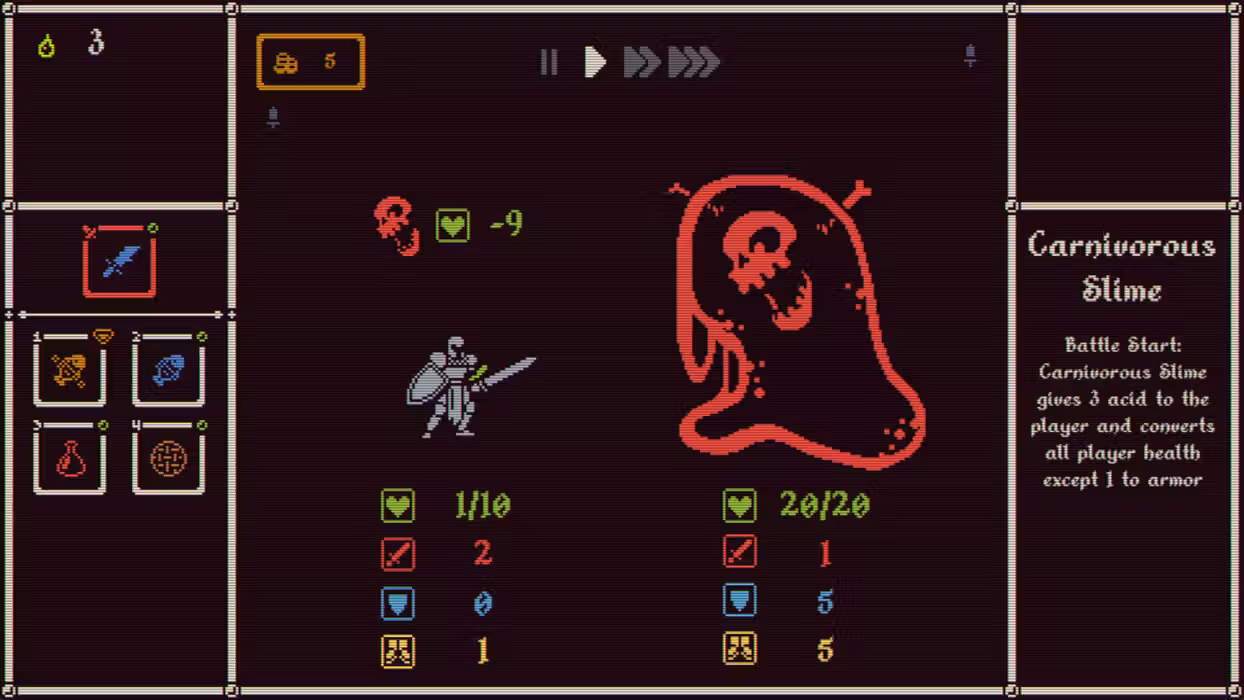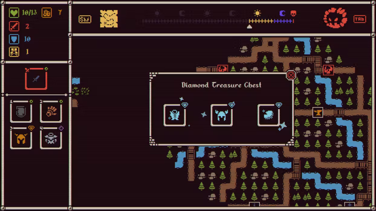 Pursue a multitude of strategies and synergies with over 350 items at your disposal to confront the unique challenge of each monstrous boss. When hunted by the Razorclaw Grizzly, whose fierce attacks ignore all armor, how much armor will you sacrifice for equipment that prioritizes maximum health, speed, or damage? The lesser monsters stalking the realms will wage a war of attrition against an unarmored hero, and should the Razorclaw Grizzly be slain, three days may not provide enough time to gather enough armor for the next great foe that hunts you. You may, in place of armor, find several items that enhance your speed and attack strength, allowing you to strike first and hard, vanquishing your enemy swiftly – sometimes before it’s able to strike at all. Then, if you luck upon the Saffron Feather, you’d be able to take advantage of your high speed to help regenerate wounds during battle. But should you find yourself hunted by the Black Knight, who absorbs your attack power as his own, high armor becomes a priority over raw attack strength – with the aid of Razor Scales armor to reflect damage back upon your enemy, and enchanted Ruby Earrings to inflict damage every other turn, the Black Knight would face steady damage without raw attack power to absorb for himself. But if you happen upon a powerful magical weapon, do you dare take it up, knowing it will strengthen the Black Knight for the fight ahead, but come to your aid should you survive it?