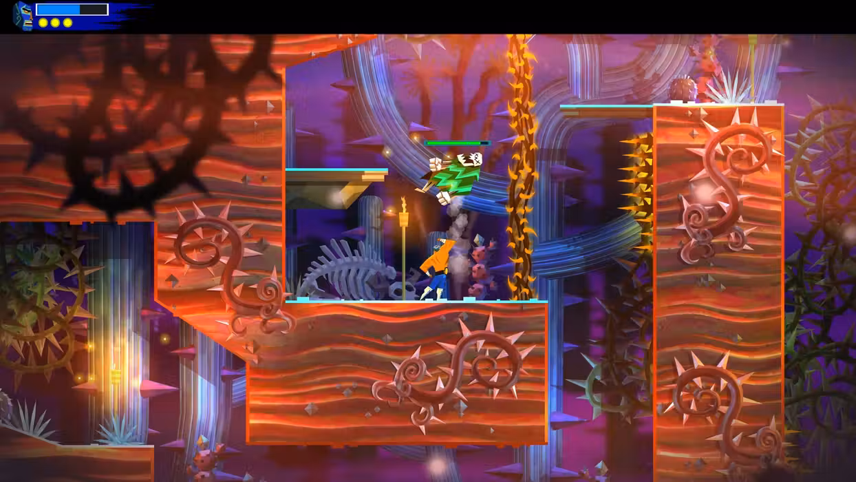 Explore a huge, hand-crafted world inspired by Mexican culture and folklore, filled with sassy new villains and weirdos (and a few old friends!). Learn a deep repertoire of bone-crunching moves to fend off the skeletal hordes and overcome a multitude of platforming challenges.