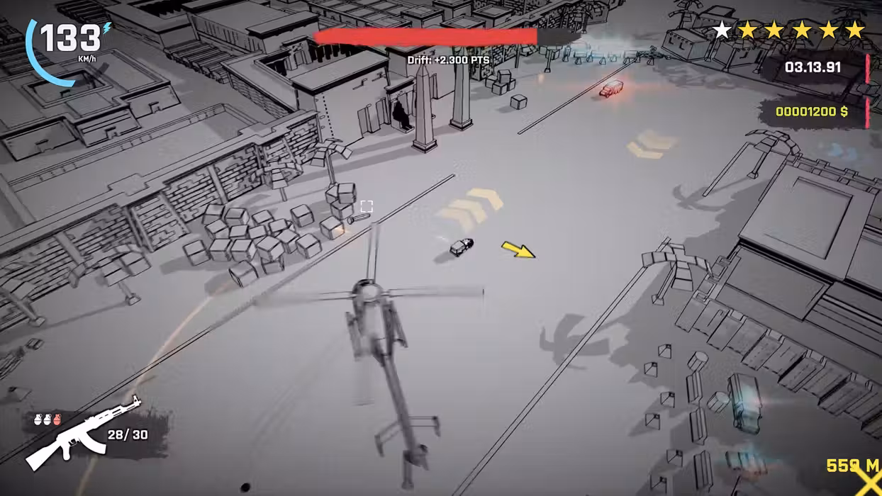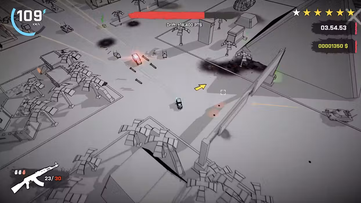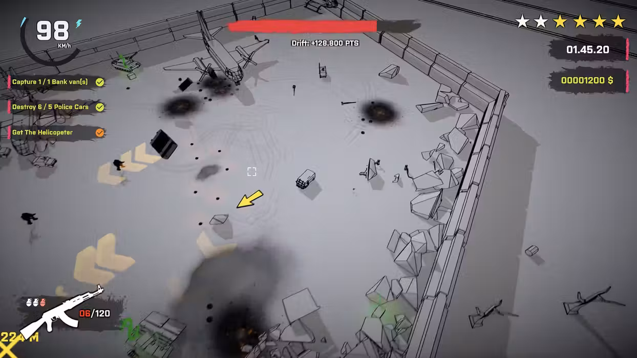 Heistfest combines fast-paced arcade driving with wide-open environments and escalating pressure. The unique black-and-white visual style gives the game a striking identity, while destruction-heavy maps reward high-speed stunts and explosive tactics.
